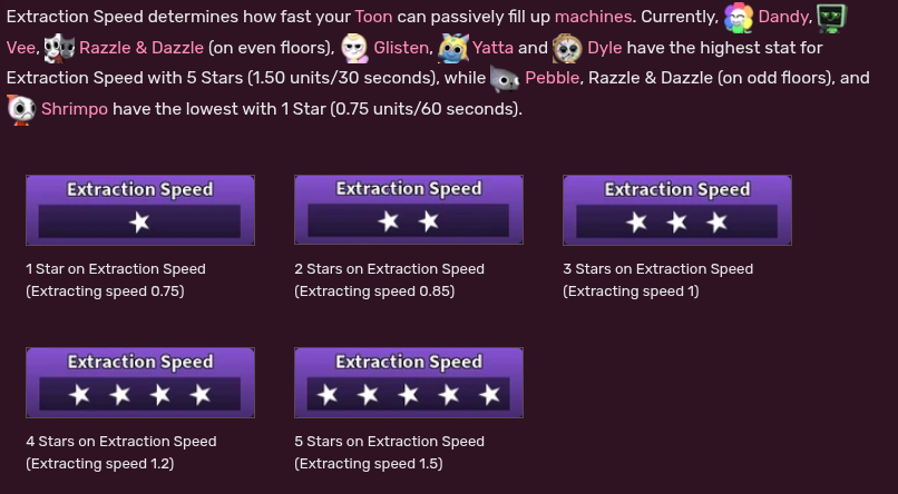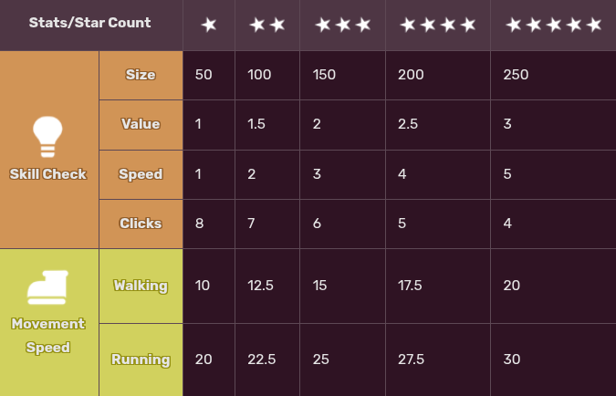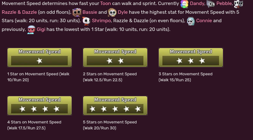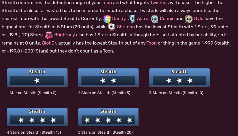 Statistics, or Stats, are modifiers that affect a Toon's gameplay elements. Every Toon has 6 stats: Health, Skill Check, Movement Speed, Stamina, Stealth, and Extraction Speed. All stats except Health are ranked in Stars. 5 Stats hold the highest Stat value, and 1 Star Stats hold the lowest. The more Stars the Stat has, the more potent it is.