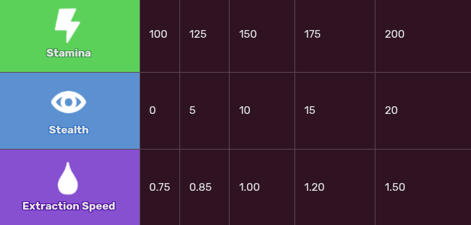 - Health is represented by red, Skill Check by orange, Movement Speed by yellow, Stamina by green, Stealth by blue and purple for Extraction Speed.