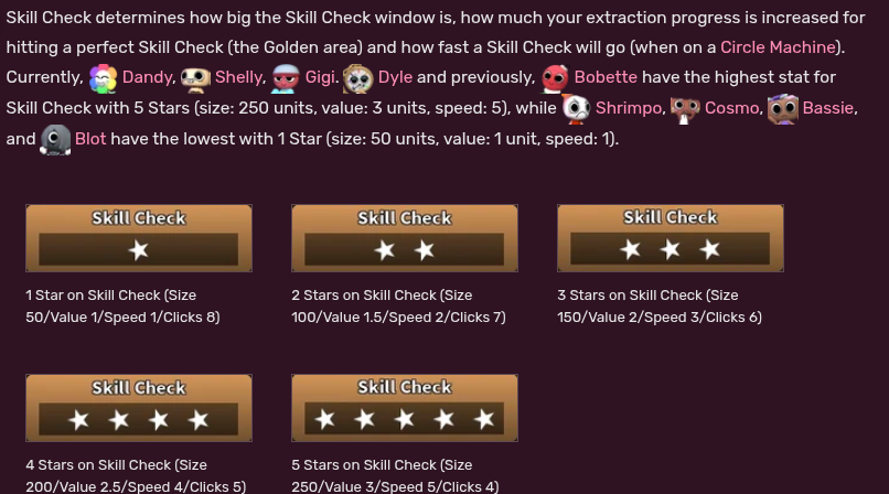 - Despite the wording, a higher Skill Check stat makes the circle shrink slower when doing Circle Machines.
